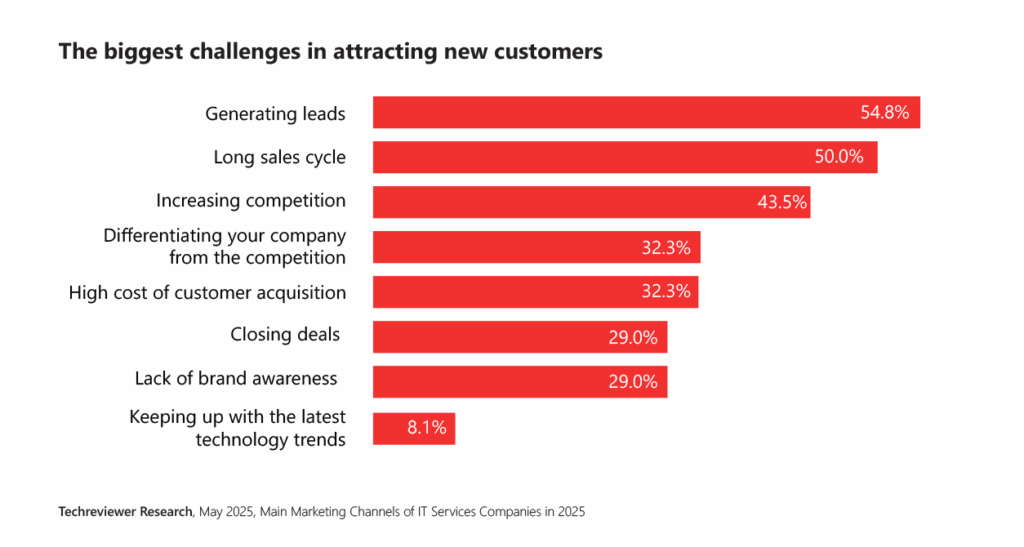 ‘IT service providers in 2025 face significant barriers in initiating customer relationships and converting leads into clients, driven by a competitive environment and the challenge of differentiating the company’s offerings. The challenge of lead generation and long sales cycles suggests that IT vendors should look for effective IT marketing strategies.”